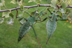 Heteropteryx is a monotypic genus of stick insects containing Heteropteryx dilatata as the only described species.[1][2] and gives its name to the family of the Heteropterygidae. Their only species may be known as jungle nymph, Malaysian stick insect, Malaysian wood nymph, Malayan jungle nymph, or Malayan wood nymph and because of their size it is commonly kept in zoological institutions and private terrariums of insect lovers. It originates in Malay Archipelago, more precisely on the Malay Peninsula and Borneo and is nocturnal.