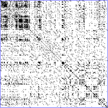 A DNA dot plot of a human zinc finger transcription factor (GenBank ID NM_002383), showing regional self-similarity. The main diagonal represents the sequence's alignment with itself; lines off the main diagonal represent similar or repetitive patterns within the sequence.