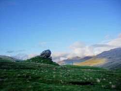 No historical source gives any firm information on the boundaries of the Kingdom of Strathclyde, but suggestions have been offered on the basis of place-names and topography. Near the north end of Loch Lomond, which can be reached by boat from the Clyde, lies Clach nam Breatann, the Rock of the Britains, which is thought to have gained its name as a marker at the northern limit of Alt Clut.[6] The Campsie Fells and the marshes between Loch Lomond and Stirling may have represented another boundary. To the south, the kingdom extended some distance up the strath of the Clyde, and along the coast probably extended south towards Ayr.[7]