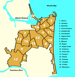 Suburbs of Napier include: