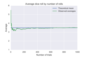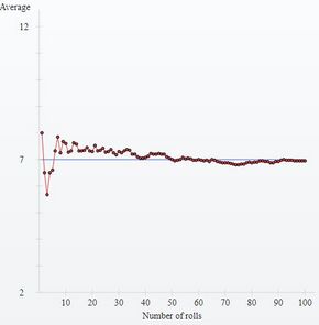 According to the law of large numbers, if a large number of six-sided dice are rolled, the average of their values (sometimes called the sample mean) will approach 3.5, with the precision increasing as more dice are rolled.