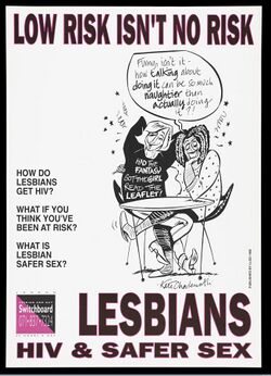 In terms of medical issues with regard to sexual practices between women, the sexual identification of women who consult a medical professional is usually not sought nor volunteered, due to the misconceptions and assumptions about sexuality and the hesitancy of some women in disclosing their accurate sexual histories even to a physician.[2] Lack of differentiation between lesbians and heterosexual women in medical studies that concentrate on health issues for women skews results for lesbians and non-lesbian women. Many women who do not participate in heterosexual activity do not go to see a physician because they do not require birth control, which is the initiating factor for most women to seek consultation with a gynecologist when they become sexually active.[3] As a result, these women are not screened regularly with pap smears because they have a lower perceived risk of acquiring a sexually transmitted infection or types of cancer. Lesbians are less likely than their heterosexual and bisexual counterparts to get screened for cervical cancer, with some being refused screenings by medical professionals.[4]