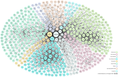 Diagram showing Linking Open Data datasets. UMBEL is near the hub, below and to the right of the central DBpedia.