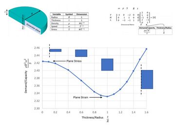 Consider the case of a thin, solid, parallel-sided rotating disc of axial thickness t (L) and radius R (L). The disc has a density ρ (M/L3), rotates at an angular velocity ω (T−1) and this leads to a stress S (T−2L−1M) in the material. There is a theoretical linear elastic solution, given by Lame, to this problem when the disc is thin relative to its radius, the faces of the disc are free to move axially, and the plane stress constitutive relations can be assumed to be valid. As the disc becomes thicker relative to the radius then the plane stress solution breaks down. If the disc is restrained axially on its free faces then a state of plane strain will occur. However, if this is not the case then the state of stress may only be determined though consideration of three-dimensional elasticity and there is no known theoretical solution for this case. An engineer might, therefore, be interested in establishing a relationship between the five variables. Dimensional analysis for this case leads to the following (5 − 3 = 2) non-dimensional groups: