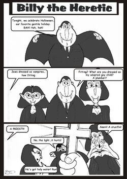The "story", if you can even call it that, involves an Aryan boy named Billy who is adopted by the Rothsteins, a Jewish family. As befitting for the kind of work this is, the Rothsteins are portrayed as greedy, big-nosed, and at the center of an International Jewish Conspiracy. However, due to the terrible artstyle, the Jewish characters more resemble cartoon vampires than the Le Happy Merchant look the creators were going for, which is especially noticeable in the Halloween strip where they dress up as vampires (which also gives the artist another excuse to be lazy, not that he needed one of course). The main problem with the story, however, is that it's just really boring. Despite constantly alleging conspiracies, very little of it is actually shown and it just leads to being a bland regurgitation of neo-Nazi talking points. What makes it worse is how even ignoring his bigotry, Billy is just a really unlikable character, as he is a petulant, abusive bully, and he comes across as less likeable than his Jewish family, who are intentionally written to be unlikeable.[7] It doesn't help that many of the Rothsteins' "evil" actions, such as supporting LGBTQ+ equality, civil rights, and donating to fight AIDS in Africa, only look bad if you subscribe to the extreme neo-Nazi views of the creator. But what makes the comic particularly infamous is the horrible art. The art is incredibly lazy and doesn't have any color, and in one comic that is supposed to critique affirmative action, Billy's dad gives all his dark-skinned workers a raise, but because there is no color or even shading it looks like he's giving everyone a raise.[8] In another, Billy and his father are supposed to be reading newspapers, but the artist just draws their heads floating above the newspapers.[9] It says something when even people who like Ben Garrison and Stonetoss don't take this stuff seriously.