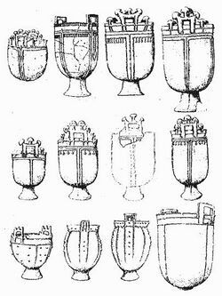 Ursula Brosseder, however, argues that there are no intermediate types between the forms of the cauldron known for the Xiongnu and those known for the European Huns.[100] She also notes that the cauldrons, as a single archaeological artifact, cannot prove a Xiongnu-Hun migration.[101] Nor can it be assumed, she argues, that the Huns and Xiongnu used their cauldrons in the same manner, as the Xiongnu cauldrons are usually deposited in graves, whereas the Hun cauldrons are found deposited alone near water.[102] Pohl further notes that such cauldrons are absent from the areas controlled by the "Iranian Huns," Bactria and Sogdia.[103]