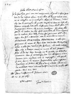 Around a hundred letters from Patricius have survived, including a letter of 26 June 1572 to Bernardino Telesio, which is particularly important as a source, in which he critically examines his philosophical principles, and an autobiographical letter to his friend Baccio Valori, dated 12 January 1587.[92] They make up only a modest part of his correspondence and largely date from the years in Ferrara and Rome; all letters from adolescence are lost. The style is factual and dry, without literary jewelry. This source material shows the scholar as an important figure in the cultural life of his era.[93]