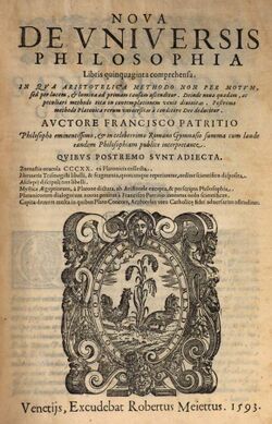 In natural philosophy, Patricius emphasized the novelty of his teaching; he stated that he was announcing "great things" and "outrageous things."[98] In fact, he made a fundamental break with the medieval and early modern scholastic tradition.[99]