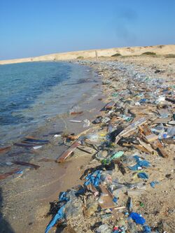 Marine debris, also known as marine litter, is human-created waste that has deliberately or accidentally been released in a sea or ocean. Floating oceanic debris tends to accumulate at the center of gyres and on coastlines, frequently washing aground, when it is known as beach litter or tidewrack. Deliberate disposal of wastes at sea is called ocean dumping. Naturally occurring debris, such as driftwood and drift seeds, are also present. With the increasing use of plastic, human influence has become an issue as many types of (petrochemical) plastics do not biodegrade quickly, as would natural or organic materials.[1] The largest single type of plastic pollution (~10%) and majority of large plastic in the oceans is discarded and lost nets from the fishing industry.[2] Waterborne plastic poses a serious threat to fish, seabirds, marine reptiles, and marine mammals, as well as to boats and coasts.[3]