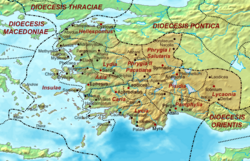 In 133 BC, the remnants of Phrygia passed to Rome. For purposes of provincial administration, the Romans maintained a divided Phrygia, attaching the northeastern part to the province of Galatia and the western portion to the province of Asia. There is some evidence that western Phrygia and Caria were separated from Asia in 254–259 to become the new province of Phrygia and Caria.[46] During the reforms of Diocletian, Phrygia was divided anew into two provinces: "Phrygia I", or Phrygia Salutaris (meaning "healthy" in Latin), and Phrygia II, or Pacatiana (Greek Πακατιανή, Pakatiane, unknown etymology, but translated as "peaceful"), both under the Diocese of Asia. Salutaris with Synnada as its capital comprised the eastern portion of the region and Pacatiana with Laodicea on the Lycus as capital of the western portion. The provinces survived up to the end of the 7th century, when they were replaced by the Theme system. In the Late Roman, early "Byzantine" period, most of Phrygia belonged to the Anatolic theme. It was overrun by the Turks in the aftermath of the Battle of Manzikert (1071).[47] The Turks had taken complete control in the 13th century, but the ancient name of Phrygia remained in use until the last remnant of the Byzantine Empire was conquered by the Ottoman Empire in 1453.