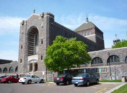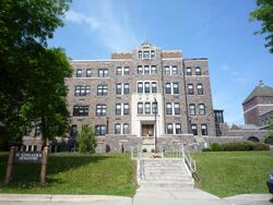 Tower Hall is St. Scholastica's castle-like central building. Its origins date to a picnic in around 1907, when the Diocese of Duluth's Bishop James McGolrick commented that the top of the hill at the College's current site was a perfect location for a building.[11] According to the historic records of Sister Agnes Somers, McGolrick and a group of students and Sisters climbed to the top of the hill and placed a pile of stones, symbolizing the cornerstone of what would eventually become Tower Hall.[12] The following year saw the groundbreaking and start of construction for Tower Hall. Its first unit was completed in 1909. That September, 75 students from the Institute of the Sacred Heart were relocated to what was then called Villa St. Scholastica. Tower Hall was completed in 1928, and had two towers, a north to south axis of 375 feet, turrets at each end, recessed fenestration, and Tudor towers flanking the façade.