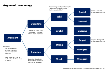 Inductive reasoning is a form of argument that—in contrast to deductive reasoning—allows for the possibility that a conclusion can be false, even if all of the premises are true.[33] This difference between deductive and inductive reasoning is reflected in the terminology used to describe deductive and inductive arguments. In deductive reasoning, an argument is "valid" when, assuming the argument's premises are true, the conclusion must be true. If the argument is valid and the premises are true, then the argument is "sound". In contrast, in inductive reasoning, an argument's premises can never guarantee that the conclusion must be true; therefore, inductive arguments can never be valid or sound. Instead, an argument is "strong" when, assuming the argument's premises are true, the conclusion is probably true. If the argument is strong and the premises are true, then the argument is "cogent".[34] Less formally, an inductive argument may be called "probable", "plausible", "likely", "reasonable", or "justified", but never "certain" or "necessary". Logic affords no bridge from the probable to the certain.