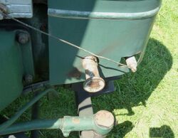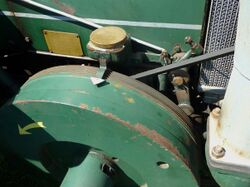 The engine is then turned over with a starting handle placed in the starting dog on the flywheel. This is aided by the decompression valve, which decompresses the engine and makes it easier to turn over to allow the flywheel to gain speed and momentum to turn the engine through compression, and get the engine to fire. A spiral groove on the perimeter of the flywheel carries a wheel on the decompressor mechanism and is used to determine the number of revolutions before the decompressor disengages. This is generally up to three revolutions, but can be anything up to six revolutions.[2] Depending on the condition of individual tractors, it may need considerable physical exertion to start a Marshall.
