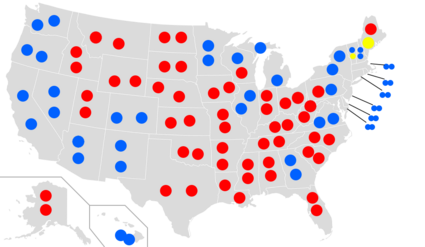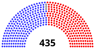 The House has 435 voting members who are elected from districts within all of the states. Since representatives only serve two-year terms, all 435 seats go up for election in every cycle.[6] As a result, the House can often be more dynamic than the Senate due to the possibility of a greater amount of its members being tossed out. In roughly one-third of all elections since 1856, the House has changed party majorities.[7] Almost all of these changes in partisan majority happen during midterm (meaning non-presidential) elections as people end up having buyer's remorse upon finding out that they don't like the current president so much.