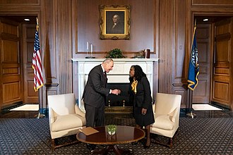 One of the most important Constitutional powers granted to the Senate is the requirement that they approve of all presidential nominations to executive and judicial offices. The president usually nominates candidates after confiding in Senators of their party, and these nominees are sent to the Senate Judiciary Committee to be interviewed during a public hearing.[81]