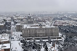 The highest recorded temperature in central Madrid's Retiro Park was on 14 August 2021, with 40.7 °C (105.3 °F). The lowest recorded temperature was on 16 January 1945 with −10.1 °C (13.8 °F) in Madrid.[100] At the airport, on the eastern side of Madrid, the highest recorded temperature was on 14 August 2021, at 42.7 °C (108.9 °F). The lowest recorded temperature was on 16 January 1945 at −15.2 °C (4.6 °F).[101] From 7 to 9 January 2021, Madrid received the most snow in its recorded history since 1904; Spain's meteorological agency AEMET reported between 50 and 60 cm (20 and 24 in) of accumulated snow in its weather stations within the city.[102]