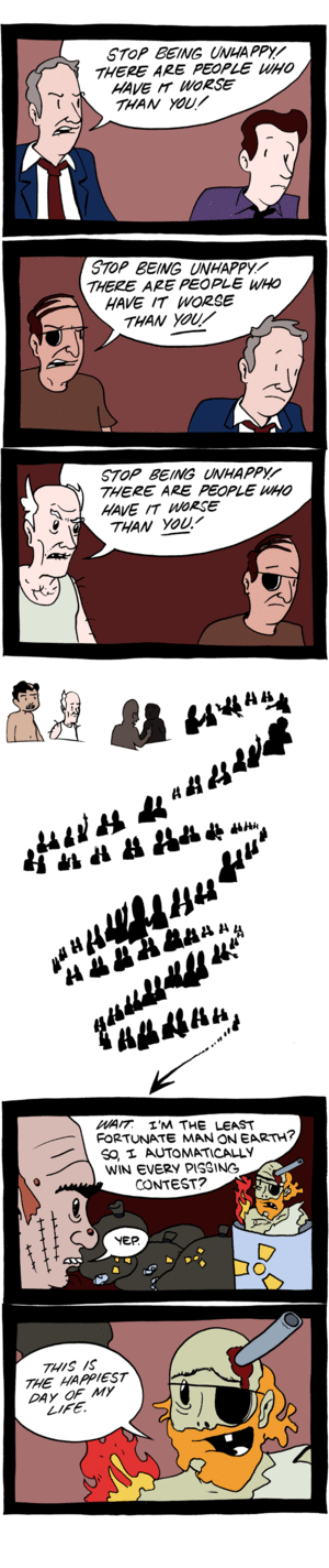 - ↑ This has also been expressed as "the good old 'someone, somewhere has it worse so you have no right to complain' fallacy" and the "'starving kids in Africa' fallacy".