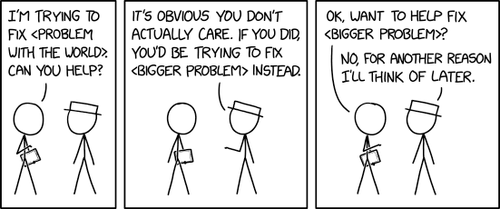 Your point that the world contains multiple problems is a real slam-dunk argument against fixing any of them.