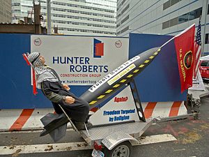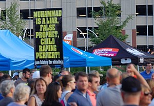 Stop Islamization of America (SIOA) and the Freedom Defense Initiative are designated as hate groups by the Anti-Defamation League[136] and the Southern Poverty Law Center.[137][138][139] In August 2012 SIOA generated media publicity by sponsoring billboards in New York City Subway stations claiming there had been 19,250 terrorist attacks by Muslims since 9/11 and stating "it's not Islamophobia, it's Islamorealism."[140] It later ran advertisements reading "In any war between the civilized man and the savage, support the civilized man. Support Israel. Defeat Jihad." Several groups condemned the advertisements as "hate speech" about all Muslims[141][142][143] while others defended the ad as a narrow criticism of violent Jihadism.[144] In early January 2013 the Freedom Defense Initiative put up advertisements next to 228 clocks in 39 New York subway stations showing the 2001 attacks on the World Trade Center with a quote attributed to the 151st verse of chapter 3 of the Quran: "Soon shall we cast terror into the hearts of the unbelievers."[145][146] The New York City Transit Authority, which said it would have to carry the advertisements on First Amendment grounds, insisted that 25% of the ad contain a Transit Authority disclaimer.[147][148] These advertisements also were criticized.[149][150]