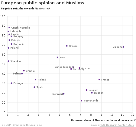 The extent of negative attitudes towards Muslims varies across different parts of Europe. Polls in Germany[154][155] and the Czech Republic[156] (as well as South Korea)[157] have suggested that most respondents do not welcome Muslim refugees in those countries.