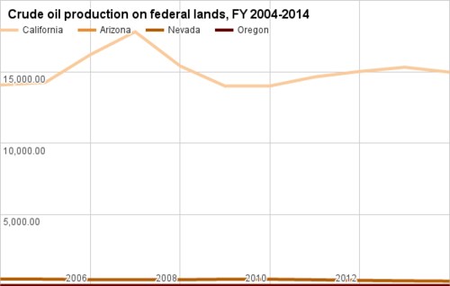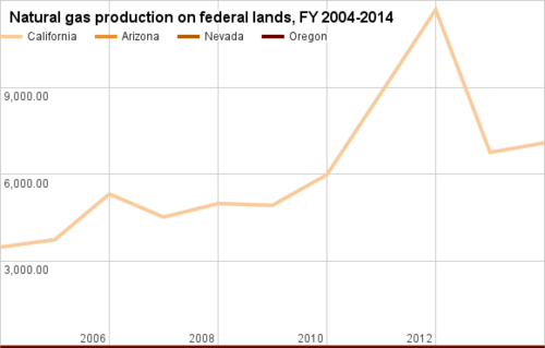 The Office of Natural Resources Revenue (ONRR) provides data on mineral production on federal lands. The charts and tables below show federal onshore oil and/or natural gas production (in terms of the amounts sold) for fiscal years 2004 to 2014 for California, its adjacent states (provided for comparison), and the United States as a whole.[22]