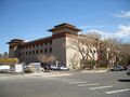 On October 29, 1916, a devastating fire destroyed the main building of the school, prompting its relocation. In 1917, the new school facility was constructed on its present site above Mundy Heights at the Paso del Norte, with the land donated by several El Paso residents. In a period when United States architects were designing in styles adopted especially from Europe, Kathleen Worrell, wife of the university's dean, was attracted by photographs of the Kingdom of Bhutan in a 1914 issue of National Geographic magazine, which showed the dzong architecture style of its Buddhist monasteries.[12] The resemblances between the local terrain and mountainous features of Bhutan inspired her to propose designing early buildings of the mining school in the dzong style. Liking its distinctiveness, administrations have continued to choose that style for additional facilities, including the Sun Bowl football stadium and parking garages. Dzong architecture has characteristics such as sloping sides, markedly overhanging roofs, and bands of colored decoration.[13]