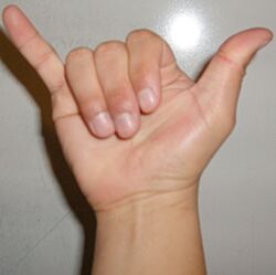 This hand symbol represents the traditional tool used by miners, the pickaxe, and is similar to the shaka sign and the letter Y in American sign language. This gesture is made by UTEP fans when UTEP players are shooting free throws at basketball games, or any time UTEP kicks off at a football game. It originated during a cheer camp by the UTEP cheerleading squad during the early 1980s.[45]