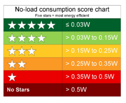 Various initiatives, such as the EU Common External Power Supply have been announced to standardize the interface to the charger, and to promote energy efficiency of mains-operated chargers. A star rating system is promoted by some manufacturers, where the most efficient chargers consume less than 0.03 watts and obtain a five-star rating.