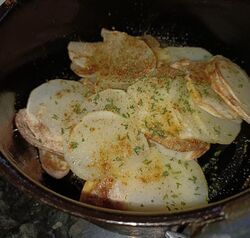 The earliest known recipe for something similar to today's potato chips is in William Kitchiner's book The Cook's Oracle published in 1817, which was a bestseller in the United Kingdom and the United States.[2] The 1822 edition's recipe for "Potatoes fried in Slices or Shavings" reads "peel large potatoes... cut them in shavings round and round, as you would peel a lemon; dry them well in a clean cloth, and fry them in lard or dripping".[3][4] An 1825 British book about French cookery calls them "Pommes de Terre frites" (second recipe) and calls for thin slices of potato fried in "clarified butter or goose dripping", drained and sprinkled with salt.[5] Early recipes for potato chips in the US are found in Mary Randolph's Virginia House-Wife (1824)[6] and in N.K.M. Lee's Cook's Own Book (1832),[7] both of which explicitly cite Kitchiner.[8]
