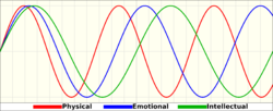Most biorhythm models use three cycles: a 23-day physical cycle, a 28-day emotional cycle, and a 33-day intellectual cycle.[5] Although the 28-day cycle is the same length as the average woman's menstrual cycle and was originally described as a "female" cycle (see below), the two are not necessarily in synchronization. Each of these cycles varies between high and low extremes sinusoidally, with days where the cycle crosses the zero line described as "critical days" of greater risk or uncertainty.