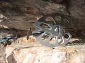 Hooks. These are steel hooks of various shapes (e.g. bat hook, talon hook, grappling hook, etc.,) that are hung from cracks and flakes (e.g. the fifi hook and skyhook). Mostly used in aid climbing, but they have been used in extreme traditional climbing routes as a last resort (i.e.hook placements may not withstand a dynamic fall). A particular type of hook is a rivet hanger that can be attached to old metal rivets–an example being Australian carrot bolts–permanently fastened into the rock face.[6]