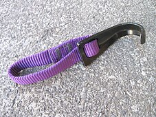 Quickdraws are used by climbers to connect ropes to fixed items such as bolted anchors in sport climbing, or protection devices in traditional climbing. The quickdraw consists of two non-locking carabiners connected together by a short, pre-sewn loop of webbing. They are used to reduce the friction and drag between the rope of the fixed item (i.e. instead of just clipping into a carabiner clipped into the bolt); in competition climbing the quickdraws are already hanging from the bolts, which is called pinkpointing in sport climbing (i.e. instead of the lead climber carrying the quickdraws, they are already in-situ). The quickdraws used on advanced sport and competition climbing routes often have a "bent-gate" on the lower carabiner to make clipping-in easier.[11][19]