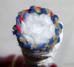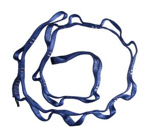 Modern webbing (or "tape"), is made of strong tubular nylon and/or the even stronger spectra/dyneema material. Climbers use webbing that has been sewn (using a certified standard of reinforced stitching) into various lengths of closed loops called "slings" (or "runners") that can be used in a wide range of situations, including wrapping around sections of rock (for abseiling, or creating belay anchors, or as passive protection), or tied to other pieces of equipment (often via carabiners) to create a longer version of a quickdraw or even a makeshift lanyard.[1][11][13]