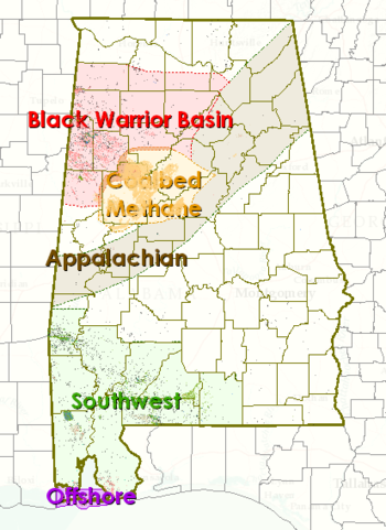 According to the U.S. Energy Information Administration (EIA), Alabama is home to crude oil, natural gas, and coalbed methane reserves as of 2016. The map below shows the locations of these reserves. According to the U.S. Energy Information Administration (EIA), "More than two-thirds of the state's onshore natural gas production comes from coalbed methane—natural gas derived from coal seams." As of 2016, coalbed methane was found in the Black Warrior Basin (in red on the map) and the Cahaba Basin (in yellow).[4]