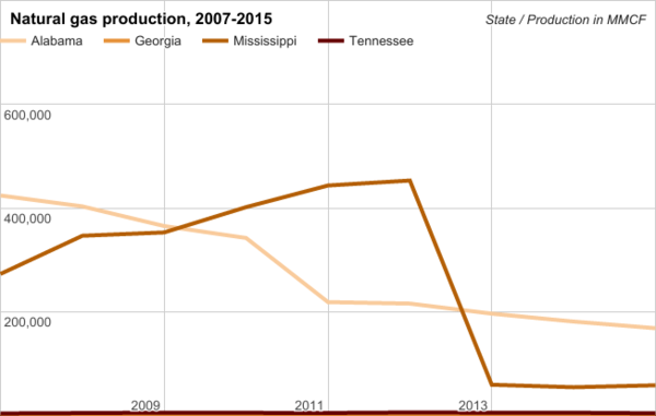 Natural gas production in Alabama and neighboring states (2007-2015)