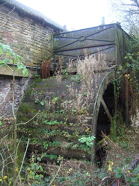 The overshot water wheel is immobile and has not been used since 1956, it is now off its bearings and covered in vegetation and in need of renovation, it is the largest wheel of its type to survive in Sheffield. It has a diameter of 18ft 6in and a width of 11ft 8in with 8 cast-iron spokes to each side and 42 buckets. Above the wheel is a cast iron penstock now permanently closed. In the 1950s it was estimated that the wheel could generate 25 horse power using Volumetric flow rate data. Behind the wheel are a dam and mill race constructed to drive the wheel.[5]