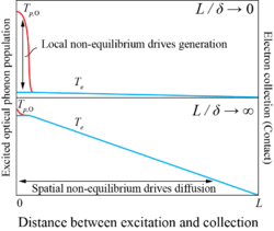In a nanoscale device, this temperature is approximately equal to the temperature of the device itself.[1][4] However, in a macroscale device the generated electrons accumulate faster than they are collected. Thus, the electron population is heated up to the optical phonon temperature and further generation is inhibited. The down-conversion is simultaneously inhibited as the acoustic phonon population is heated to the optical phonon temperature. Thus, the large pV cell develops a near-equilibrium state where it is heated. At best, it will act like a thermoelectric generator and exhibit thermoelectric effects. Such a device is called a thermovoltaic,[5][6] rather than a phonovoltaic.