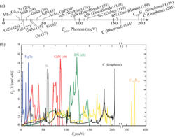 Very few materials offer this combination of properties. Indeed, the vast majority of crystals have optical phonon energies limited to below 50 meV, and those with more energetic optical phonons tend to have much more energetic band gaps. In general, a material with a first-row element (periodic table) is required to have a highly energetic optical phonon. However, the high electronegativity of a first-row elements tends to create a very large band gap, as in diamond and the boron nitride allotropes.[10] Graphene is one of the few materials which diverges from this trend, with no bandgap and an exceptionally energetic optical phonon mode near 200 meV.[11][12] Thus, graphene has been the initial target for development of a phonovoltaic material through the opening and tuning of its bandgap.[13][3]