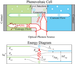 While the thermoelectric generator converts heat, a broad spectrum of phonon and electron energy, to electricity, the pV cell converts only a narrow band of phonon energy, i.e., only the most energetic optical phonon modes. A narrow band of excited optical phonons has much less entropy than heat. Thus, the pV cell can exceed the thermoelectric efficiency.[1][3] However, exciting and harvesting the optical phonon poses a challenge.