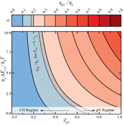 If the band gap and optical phonon mode are resonant, and the optical phonon tends to generate electrons, the phonovoltaic cell can approach the Carnot limit as [math]\displaystyle{ T_{pv}\rightarrow 0 }[/math].