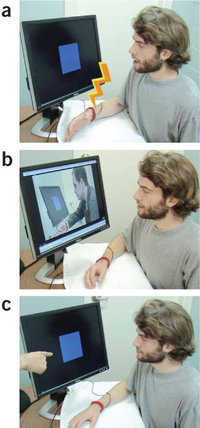Figure 4: Nonsocial and social fear learning in humans. An individual learns to fear a CS through its pairing with (a) an electric shock to the wrist (fear conditioning), (b) a learning model’s expression of distress (observational fear learning), and (c) verbal information about its aversive qualities (instructed fear). Reprinted by permission from Macmillan Publishers Ltd: Nature Neuroscience (Olsson and Phelps, 2007), copyright (2007).