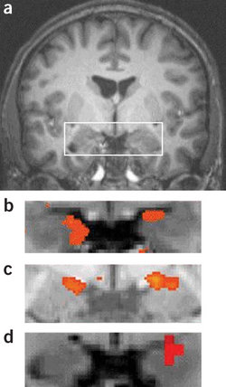 Figure 3: Fear learning in the human amygdala. (a) The outlined box contains the area of the medial temporal lobe that includes the bilateral amygdala. (b–d) Amygdala activation to the CS is seen bilaterally after fear