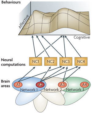 Figure 8: Potential relationship between anatomical sites, neural computations and behaviors. Brain areas (for example, A2), which are connected to form networks (ellipses), are involved in multiple neural computations (for example, NC2, NC3 and NC4) and specific computations (for example, NC4) are carried out by several areas (for example, A2 and A3). Therefore, the structure–function mapping is both one-to-many and many-to-one; in other words, many-to-many. Multiple neural computations underlie behavior. Each behavior has both affective and cognitive components, indicated by the affective and cognitive axes. Note that the axes are not orthogonal, indicating that the dimensions are not independent from each other. Brain areas with a high degree of connectivity (