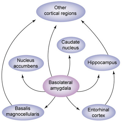 Figure 5: Projections from the basolateral complex of the amygdala to other brain areas involved in memory consolidation. Reprinted from McGaugh (2002),