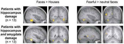 Figure 2: Functional brain imaging results in humans support a role of the amygdala in modulating visual responses to emotional stimuli. Patients with medial temporal lobe sclerosis who have lesions involving the hippocampus alone (upper row) show normal activation of the fusiform cortex when contrasting fearful vs. neutral faces (right), as do healthy subjects (not shown). Patients with additional lesions involving the amygdala (lower row) show no effect of fear expression in visual cortex. However, fusiform cortex is still normally activated in both patient groups when they perform a task on faces relative to houses (left). These results suggest that amygdala damage can have distant functional consequences on the activity of visual cortex, selectively affecting emotional modulation. Adapted from Vuilleumier (2005),