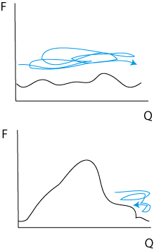 with U the potential energy, w(rN) a function chosen to promote configurations that would otherwise be inaccessible to a Boltzmann-weighted Monte Carlo run. In the example above, w may be chosen such that w = w(Q), taking high values at intermediate Q and low values at low/high Q, facilitating barrier crossing.