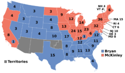 The South and most of the West were deemed certain to vote for Bryan. When early-voting Maine and Vermont went strongly Republican in September, this meant that McKinley would most likely win the Northeast. These results made the Midwest the crucial battlefield that would decide the presidency. Bryan spent most of October there—160 of his final 250 train stops were in the Midwest.[132] Early Republican polls had shown Bryan ahead in crucial Midwestern states, including McKinley's Ohio. Much of the blizzard of paper the Republican campaign was able to pay for concentrated on this area/ By September, this had its effect as silver sentiment began to fade. Morgan noted, "full organization, [Republican] party harmony, a campaign of education with the printed and spoken word would more than counteract" Bryan's speechmaking.[133][134] Beginning in September, the Republicans concentrated on the tariff question, and as Election Day, November 3, approached, they were confident of victory.[135]