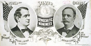 At the Clifton House, Bryan's rooms were overwhelmed with those wishing to congratulate him, despite the efforts of police to keep the crowds at bay. Bryan quipped, "I seem to have plenty of friends now, but I remember well when they were very few."[79] He left the choice of a running mate to the convention; delegates selected Maine shipbuilder Arthur Sewall. Active in Democratic Party politics, Sewall was one of the few eastern party leaders to support silver, was wealthy and could help finance the campaign; he also balanced the ticket geographically. According to historian Stanley Jones in his account of the 1896 election, "it seemed in retrospect a curious logic that gave a capitalist from Maine a leading role in a campaign intended to have a strong appeal to the masses of the South and West".[80] Bryan and Sewall gained their nominations without the ballots of the gold men, most of whom refused to vote.[81][82] Amid talk that the Gold Democrats would form their own party, Senator Hill was asked if he remained a Democrat. "I was a Democrat before the Convention and am a Democrat still—very still."[83][84]