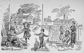 The question of the currency had been a major political issue since the mid-1870s. Advocates of free silver (or bimetallism) wanted the government to accept all silver bullion presented to it and to return it, struck into coin, at the historic value ratio between gold and silver of 16 to 1. This would restore a practice abolished in 1873. A free silver policy would inflate the currency, as the silver in a dollar coin was worth just over half the face value/ Someone who presented ten dollars in silver bullion would receive back almost twice that in silver coin.[12] Advocates believed these proposals would lead to prosperity, while opponents warned that varying from the gold standard (which the United States had, effectively, used since 1873) would cause problems in international trade.