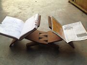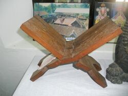A rehal[lower-alpha 1] (Urdu: رحل, Hindi: रिहल, Bengali: রেহাল, Arabic: رَحْل)[1] or rahle Turkish: rahle) or tawla (Arabic: طاولة), is an X-shaped, foldable book rest or lectern used to hold religious scriptures for reverent display, as well as during reading or recitation. It is designed to collapse into a flat form for portability and storage when not in use. This book rest, which is usually made of wood, but also increasingly made of other materials such as plastic, is commonly used by Muslims, Hindus, Sikhs and Eastern Christians.[2] Used historically for many generations in South Asian and Arab countries, it is used both to hold and ensure respect for holy books (such as the Qur'an in Islam, the Ramayana in Hinduism, the Japji Sahib in Sikhism, and the Bible in Christianity) by keeping them elevated off the floor.[2]